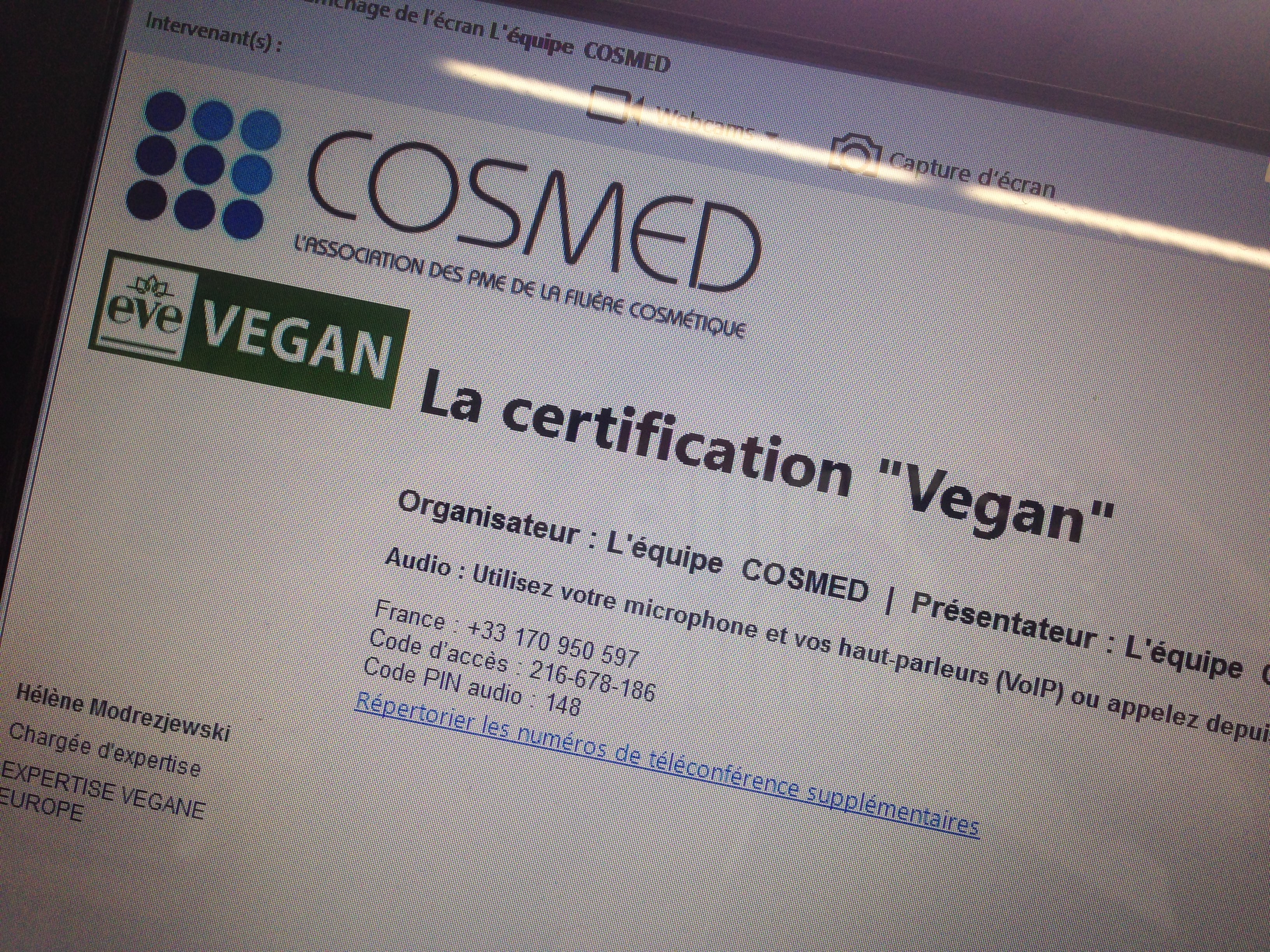 Le 7 juin dernier Vegan France Interpro, en collaboration avec COSMED (association des PME de la filière cosmétique), a eu le plaisir d’animer un « webinar » sur la certification VEGAN et le label EVE VEGAN. Le succès à été au rendez-vous puisque plus de 250 participants ont été enregistrés et de nombreuses questions ont permis de valider l’intérêt de grandes firmes et PME françaises sur cette tendance.