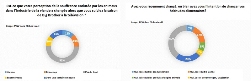 Une enquête récente parue dans le magazine financier israélien, Globes a révélée que 49% des téléspectateurs de l’émission de télé-réalité Big Brother (qui est considérée comme l’émission de divertissement la plus regardée dans le pays) se sont mis à considérer sous un autre angle la souffrance endurée par les animaux destinés à l’industrie de la viande et cela après avoir été exposé au message de Tal et aux informations qu’elle a délivrée durant la saison de diffusion de l’émission.